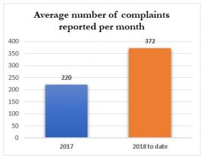 These figures mark a 154% increase in the monthly average number of data breaches reported in 2017 and a 69% increase in the number of complaints received. See charts below.